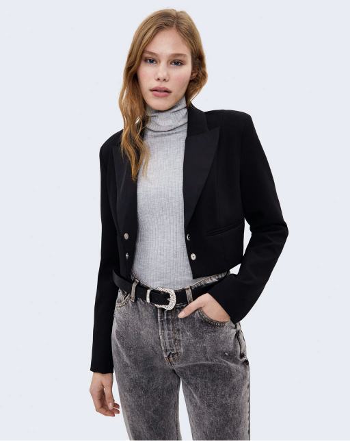 The insulated jacket is made of leather. A light layer of insulation. Details: stand-up collar, zipper, two pockets on the sides.